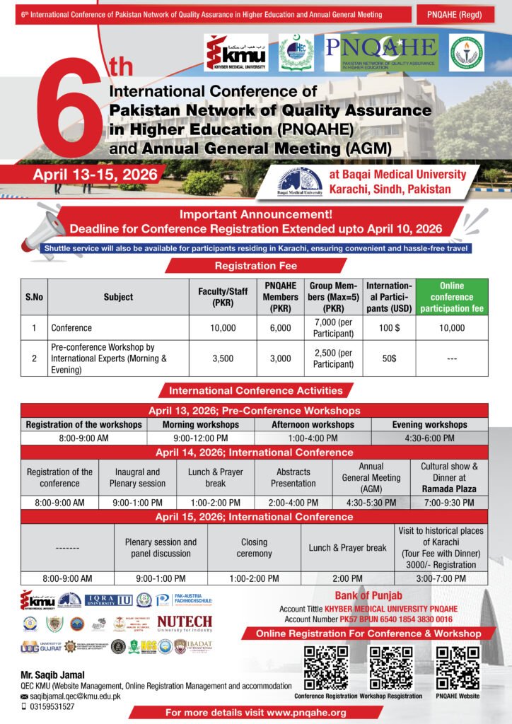 The Pakistan Network of Quality Assurance in Higher Education (PNQAHE) was founded during the 1st International Conference on "Quality Assurance in Higher Education," held on December 18-19, 2017, and hosted by Khyber Medical University (KMU) in Peshawar. KMU’s Quality Enhancement Cell (QEC) proposed PNQAHE as a platform to connect from over 250 universities across Pakistan. The initiative received strong support from both national and international participants.